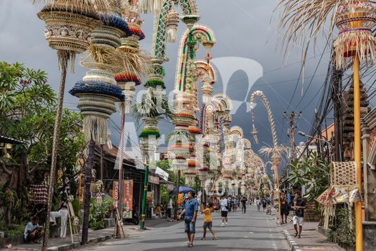 ny171225020814 Penjor, decorated bamboo poles that are a sacred symbol in Balinese Hindu culture, representing prosperity, gratitude and the connection between heaven and earth, line a street during a festival in Kerobokan on the island of Bali, Indonesia, Nov. 23, 2025. Sixty years ago, half a million Indonesians were killed in anti-Communist purges ? in Bali, memories of the massacre have been submerged so visitors see only ?a place of harmony, peace, yoga.? (Nyimas Laula/The New York Times/Fotoarena)