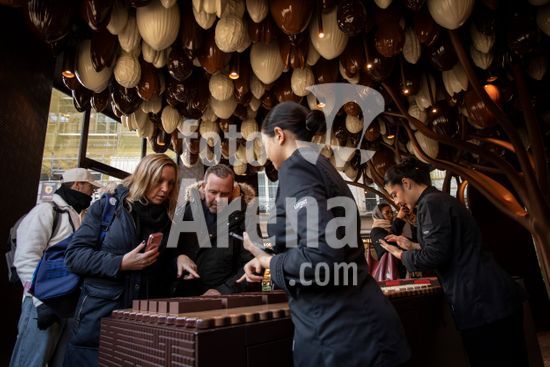ny151225085013 Customers choose chocolates under the branches of a fanciful sculpture of a tree laden with enormous nut-shaped chocolates, at Cedric et la Chocolaterie in Paris, Dec. 5, 2025. A new wave of chocolate boutiques, both from French culinary legends and award-winning upstarts, are expanding the City of Light?s offerings. (Camille McOuat/The New York Times/Fotoarena)