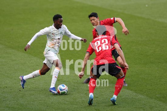 2913612 MILTON KEYNES, INGLATERRA, 28 DE MARCO: Parfait Guiagon, da Costa do Marfim, recebe pressao de Hwan Hee Chan e Seol Youngwoo, da Coreia do Sul, durante o amistoso internacional entre Coreia do Sul e Costa do Marfim no Estadio MK, em 28 de marco de 2026, em Milton Keynes, Inglaterra (Foto de Alexander Canillas/Sports Press Photo). (Alexander Canillas/SPP)