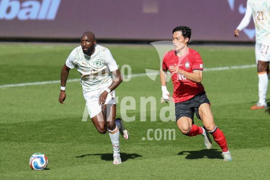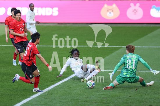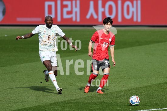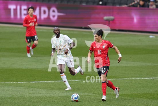 2913675 MILTON KEYNES, INGLATERRA, 28 DE MARCO: Lee Hanbeom, da Coreia do Sul, joga a bola apos cometer falta em Evann Guessand, da Costa do Marfim, durante o amistoso internacional entre Coreia do Sul e Costa do Marfim no Estadio MK, em 28 de marco de 2026, em Milton Keynes, Inglaterra (Foto de Alexander Canillas/Sports Press Photo). (Alexander Canillas/SPP)