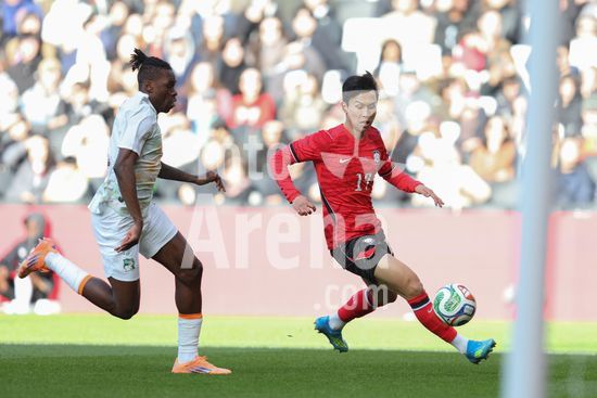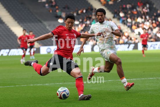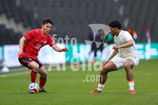 2913683 MILTON KEYNES, INGLATERRA, 28 DE MARCO: Yang Hyunjun, da Coreia do Sul, recebe pressao de Clement Akpa, da Costa do Marfim, durante o amistoso internacional entre Coreia do Sul e Costa do Marfim no Estadio MK, em 28 de marco de 2026, em Milton Keynes, Inglaterra (Foto de Alexander Canillas/Sports Press Photo). (Alexander Canillas/SPP)