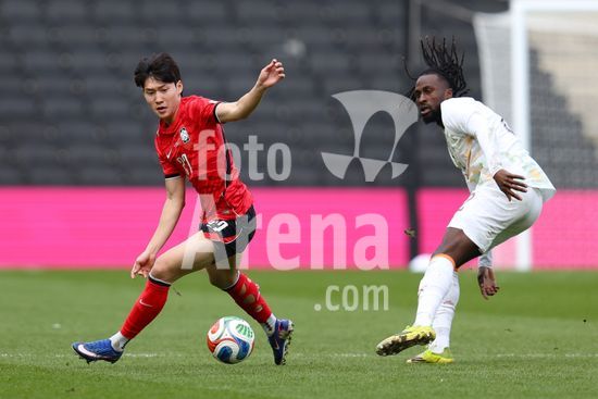 2913656 MILTON KEYNES, INGLATERRA, 28 DE MARCO: Bae Junho, da Coreia do Sul, recebe pressao de Evann Guessand, da Costa do Marfim, durante o amistoso internacional entre Coreia do Sul e Costa do Marfim no Estadio MK, em 28 de marco de 2026, em Milton Keynes, Inglaterra (Foto de Alexander Canillas/Sports Press Photo). (Alexander Canillas/SPP)