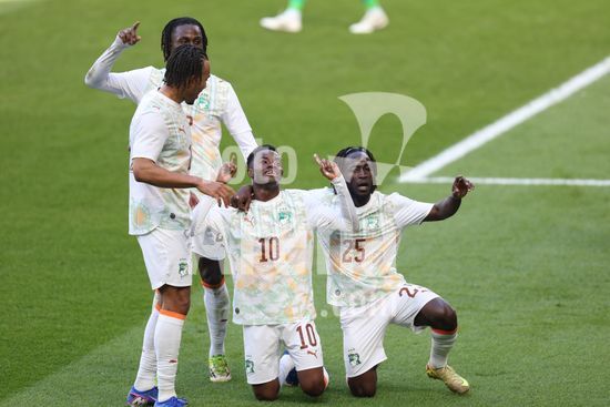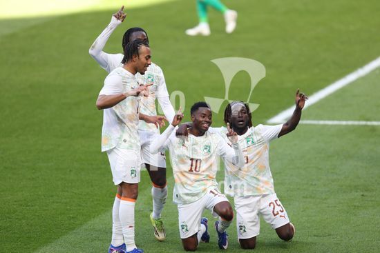 2913635 MILTON KEYNES, INGLATERRA, 28 DE MARCO: Evann Guessand, da Costa do Marfim, comemora com seus companheiros de equipe apos marcar um gol durante o amistoso internacional entre Coreia do Sul e Costa do Marfim no Estadio MK, em 28 de marco de 2026, em Milton Keynes, Inglaterra (Foto de Alexander Canillas/Sports Press Photo). (Alexander Canillas/SPP)