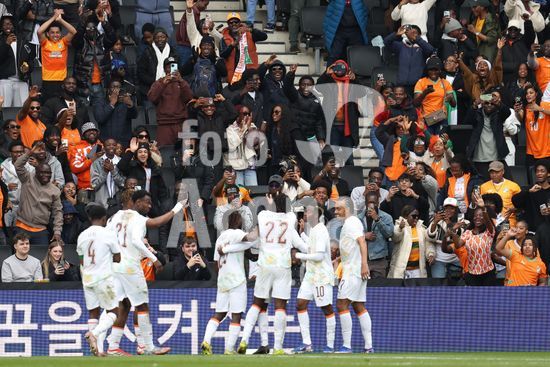2913677 MILTON KEYNES, INGLATERRA, 28 DE MARCO: Torcedores da Costa do Marfim comemoram um gol marcado por Martial Godo durante o amistoso internacional entre Coreia do Sul e Costa do Marfim no Estadio MK em 28 de marco de 2026 em Milton Keynes, Inglaterra (Foto de Alexander Canillas/Sports Press Photo) (Alexander Canillas/SPP)