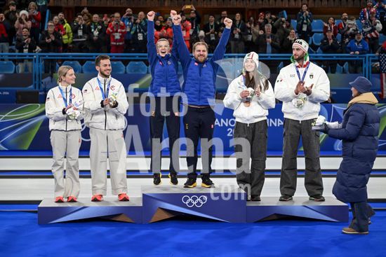 ny100226171812 Swedish athletes Isabella Wranaa and her brother, Rasmus Wranaa, celebrate their gold medal finish in the curling mixed doubles final event at the 2026 Winter Games in Cortina d'Ampezzo, Italy on Tuesday, Feb. 9, 2026. The U.S. team of Cory Thiesse, left, and Korey Dropkin took the silver, while Stefania Constantini and Amos Mosaner of Italy, right, took the bronze.. (James Hill/The New York Times/Fotoarena)