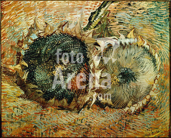 alb3657109 Sunflowers. Artist: Vincent van Gogh (Dutch, Zundert 1853-1890 Auvers-sur-Oise). Dimensions: 17 x 24 in. (43.2 x 61 cm). Date: 1887.Van Gogh painted four still lifes of sunflowers in Paris in late summer 1887. There is an oil sketch for this picture (Van Gogh Museum, Amsterdam) as well as another painting of two sunflowers also signed and dated 1887 (Kunstmuseum Bern), and a larger canvas showing four sunflower heads (Kröller-Müller Museum, Otterlo). Paul Gauguin acquired the two smaller works, and until the mid-1890s, when he sold his most prized possessions to finance his South Seas voyage, they held pride of place above the bed in his Paris apartment. Museum: Metropolitan Museum of Art, New York, USA.