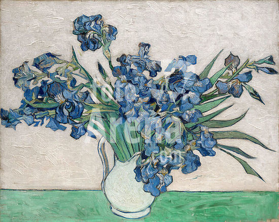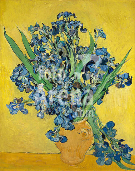 alb3637314 Irises. Artist: Vincent van Gogh (Dutch, Zundert 1853-1890 Auvers-sur-Oise). Dimensions: 29 x 36 1/4 in. (73.7 x 92.1 cm). Date: 1890.In May 1890, just before he checked himself out of the asylum at Saint-Rémy, Van Gogh painted four exuberant bouquets of spring flowers, the only still lifes of any ambition he had undertaken during his yearlong stay: two of irises, two of roses, in contrasting color schemes and formats. In the Museum's Irises he sought a "harmonious and soft" effect by placing the "violet" flowers against a "pink background," which have since faded owing to his use of fugitive red pigments. Another work from this series, Roses (1993.400.5), hangs in the adjacent gallery. Both were owned by the artist's mother until her death in 1907. Museum: Metropolitan Museum of Art, New York, USA. Author: VINCENT VAN GOGH.