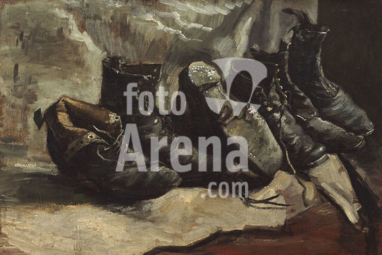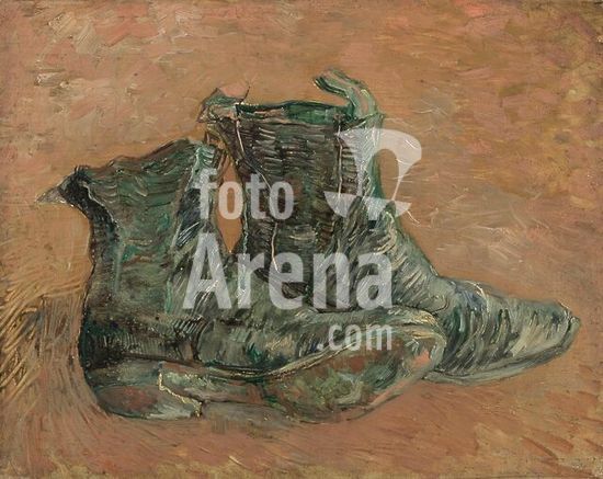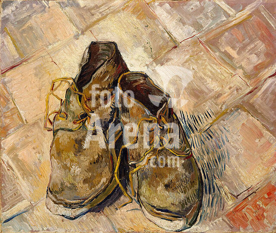 alb3643255 Shoes. Artist: Vincent van Gogh (Dutch, Zundert 1853-1890 Auvers-sur-Oise). Dimensions: 18 x 21 3/4 in. (45.7 x 55.2 cm). Date: 1888.Van Gogh painted several still lifes of shoes or boots during his Paris period. This picture, painted later, in Arles, evinces a unique return to the earlier motif. However, here Van Gogh has placed the shoes within a specific spatial context: namely, the red-tile floor of the Yellow House. Not only may we identify the setting, but perhaps the owner of the shoes as well. It has been suggested that this "still life of old peasants' shoes" may have been those of Patience Escalier, whose portrait Van Gogh executed around the same time, late summer 1888. Museum: Metropolitan Museum of Art, New York, USA.