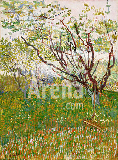 alb3645820 The Flowering Orchard. Artist: Vincent van Gogh (Dutch, Zundert 1853-1890 Auvers-sur-Oise). Dimensions: 28 1/2 x 21 in. (72.4 x 53.3 cm). Date: 1888.The arrival of spring in Arles in 1888 found Van Gogh "in a fury of work." As he wrote to his brother Theo, "the trees are in blossom and I would like to do a Provençal orchard of tremendous gaiety." Between late March and late April, the artist dedicated fourteen canvases to the subject, working in a range of sizes, formats, and styles. This composition, dominated by the angular, elongated branches of the budding trees, attests to Van Gogh's admiration for Japanese prints. His inclusion of the scythe and rake makes this one of only two orchard paintings to hint at a human presence. Museum: Metropolitan Museum of Art, New York, USA.