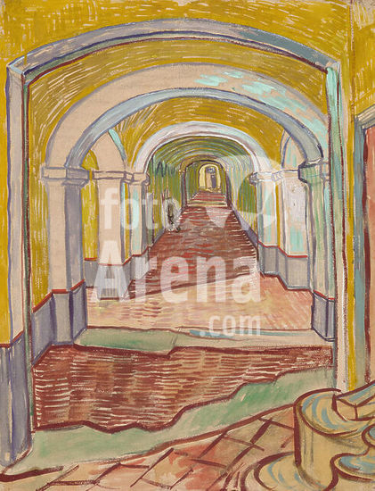 alb3666807 Corridor in the Asylum. Artist: Vincent van Gogh (Dutch, Zundert 1853-1890 Auvers-sur-Oise). Dimensions: 25 5/8 x 19 5/16in. (65.1 x 49.1cm). Date: September 1889.This haunting view of a sharply receding corridor is the artist's most powerful depiction of the asylum of Saint-Paul-de-Mausole in St. Rémy, where he spent twelve months near the end of his life and where he painted the Museum's oils of olive groves, cypresses, roses, and irises ("Women Picking Olives" (1995.535.44); "Olive Orchard" (1998.325.1); "Cypresses" (49.30); "Wheat Field with Cypresses" (1993.132); "Irises" (58.187); "Vase of Roses" (1993.400.5)). The buildings (largely remains of a twelfth-century monastery) were divided into men's and women's wards, but most of the small cells looking out on the neglected garden were empty when Van Gogh was there. One of the rooms he was able to use as a studio.The artist sent this unusually large and colorful drawing to his brother Theo, to give a picture of his surroundings. Museum: Metropolitan Museum of Art, New York, USA.