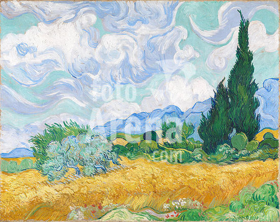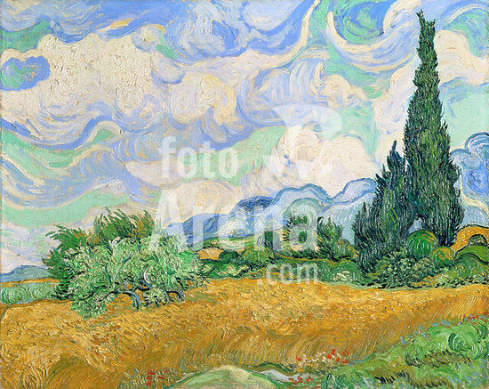 alb3676299 Wheat Field with Cypresses. Artist: Vincent van Gogh (Dutch, Zundert 1853-1890 Auvers-sur-Oise). Dimensions: 28 7/8 × 36 3/4 in. (73.2 × 93.4 cm). Date: 1889.Cypresses gained ground in Van Gogh's work by late June 1889 when he resolved to devote one of his first series in Saint-Rémy to the towering trees. Distinctive for their rich impasto, his exuberant on-the-spot studies include the Met's close-up vertical view of cypresses (49.30) and this majestic horizontal composition, which he illustrated in reed-pen drawings sent to his brother on July 2. Van Gogh regarded the present work as one of his "best" summer landscapes and was prompted that September to make two studio renditions: one on the same scale (National Gallery, London) and the other a smaller replica, intended as a gift for his mother and sister (private collection). Museum: Metropolitan Museum of Art, New York, USA.