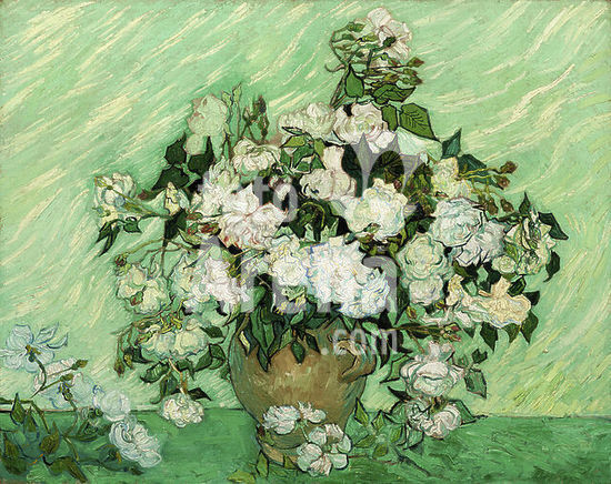 alb3629556 Roses. Artist: Vincent van Gogh (Dutch, Zundert 1853-1890 Auvers-sur-Oise). Dimensions: 36 5/8 x 29 1/8 in. (93 x 74 cm). Date: 1890.On the eve of his departure from the asylum in Saint-Rémy in May 1890, Van Gogh painted an exceptional group of four still lifes, to which both the Museum's Roses and Irises (58.187) belong. These bouquets and their counterparts--an upright composition of irises (Van Gogh Museum, Amsterdam) and a horizontal composition of roses (National Gallery of Art, Washington, D.C.)--were conceived as a series or ensemble, on a par with the earlier Sunflower decoration he made in Arles. Traces of pink along the tabletop and rose petals in the present painting, which have faded over time, offer a faint reminder of the formerly more vivid "canvas of pink roses against a yellow-green background in a green vase.". Museum: Metropolitan Museum of Art, New York, USA.