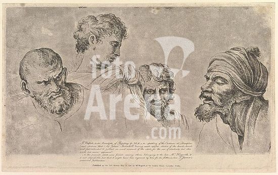 alb3623639 Four Heads From the Raphael Cartoons at Hampton Court. Artist: After Raphael (Raffaello Sanzio or Santi) (Italian, Urbino 1483-1520 Rome); Possibly by William Hogarth (British, London 1697-1764 London). Dimensions: plate: 8 1/2 x 14 in. (21.6 x 35.6 cm)sheet: 8 7/8 x 14 3/8 in. (22.5 x 36.5 cm). Publisher: Jane Hogarth (British, 1709-1789). Date: May 14, 1781. Museum: Metropolitan Museum of Art, New York, USA.