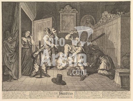 alb3649984 Hudibras Catechized (Twelve Large Illustrations for Samuel Butler's Hudibras, Plate 9). Artist: William Hogarth (British, London 1697-1764 London). Author: Illustrates Samuel Butler (British, baptized Strensham, Worcestershire 1613-1680 Covent Garden). Dimensions: sheet: 10 3/16 x 13 3/8 in. (25.8 x 34 cm) (trimmed within platemark). Publisher: Philip Overton (British, active from 1707, died 1744); John Cooper (London). Date: February 1725-26. Museum: Metropolitan Museum of Art, New York, USA.