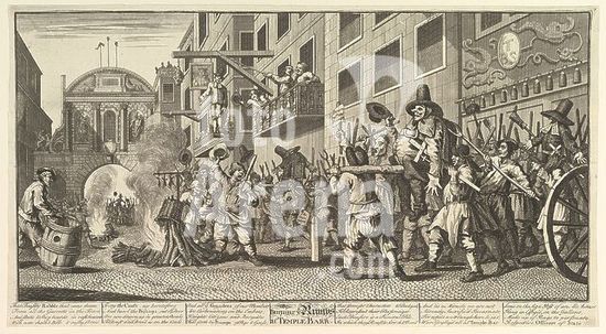 alb3669370 Burning the Rumps at Temple Bar (Twelve Large Illustrations for Samuel Butler's Hudibras, Plate 11). Artist: William Hogarth (British, London 1697-1764 London). Author: Illustrates Samuel Butler (British, baptized Strensham, Worcestershire 1613-1680 Covent Garden). Dimensions: sheet: 10 3/4 x 19 3/4 in. (27.3 x 50.1 cm). Date: 1725-68. Museum: Metropolitan Museum of Art, New York, USA.