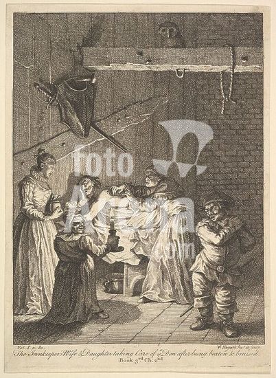 alb3679330 The Innkeeper's Wife and Daughter Taking Care of ye Don after Being Beaten and Bruised (Six Illustrations for Don Quixote). Artist: William Hogarth (British, London 1697-1764 London). Author: Illustration of Miguel de Cervantes Saavedra (Spanish, Alcalá 1547-1616 Madrid). Dimensions: Sheet: 9 15/16 x 7 3/16 in. (25.2 x 18.3 cm). Date: 1756 or after. Museum: Metropolitan Museum of Art, New York, USA.