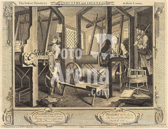 917_05_WHA_091_0319 Illustration titled 'Industry and Idleness'. The illustration depicts the industrious apprentice gets on with his weaving while the idle apprentice sleeps off his hangover. First plate in William Hogarth's series. Dated 18th Century.