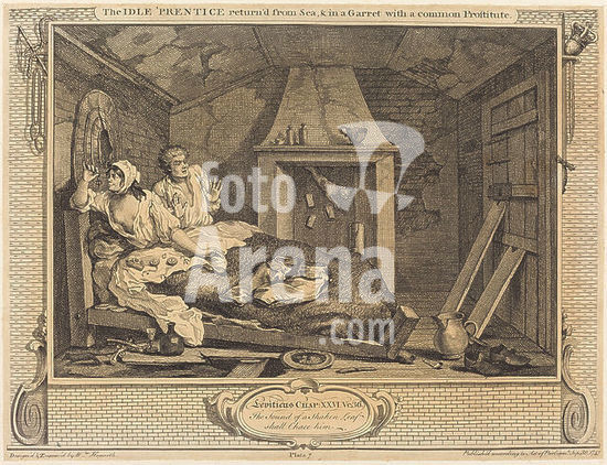alb3742586 The Idle 'Prentice return'd from Sea & in a Garret with a common Prostitute. Dated: 1747. Medium: etching and engraving. Museum: National Gallery of Art, Washington DC. Author: William Hogarth.