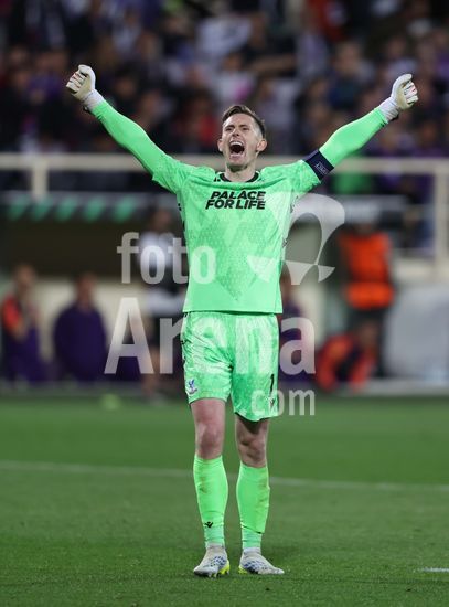 2926603 FIORENTINA, ITALIA, 16 DE ABRIL: Dean Henderson, do Crystal Palace, comemora apos o apito final, garantindo a classificacao do Crystal Palace para a semifinal da Liga Conferencia da UEFA, no jogo de volta das quartas de final, entre ACF Fiorentina e Crystal Palace FC, no Estadio Artemio Franchi, em Fiorentina, Italia, em 16 de abril. (Daniel Weir/SPP)