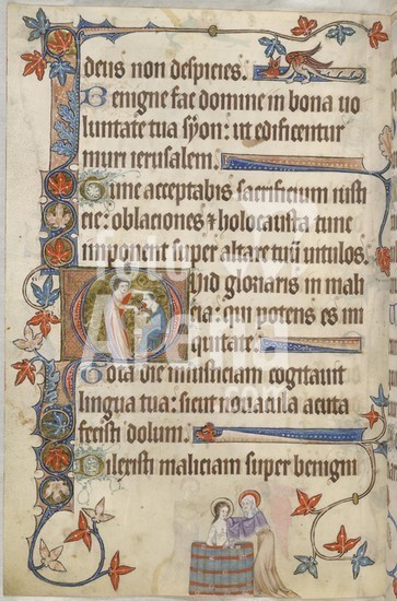 alb4091207 Psalm 51; girl bathing. Luttrell Psalter. England [East Anglia]; circa 1325-1335. [Whole folio] End of Psalm 50. Psalm 51 beginning with initial 'Q', a nimbed figure pulling with pincers the tongue of a seated man. Border decoration with small animal grotesque in the upper margin. In the lower margin, a nimbed naked young woman bathes in a wooden tub, assisted by an older woman. It is perhaps an episode from the girlhood of the Virgin, in which she is cleansed in preparation for her redemptive role, aided by her mother, St Anne Image taken from Luttrell Psalter. Originally published/produced in England [East Anglia]; circa 1325-1335. Source: Add. 42130, f.97v. Language: Latin.