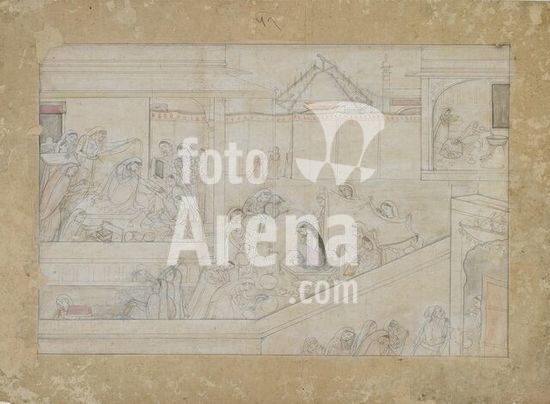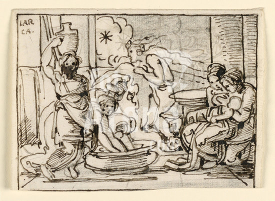 alb9530364 At left, women prepare the bath in a large, round basin, while another woman brings the water. At right are two seated figures, one holding the child. The Star of Bethlehem is visible through an opening in the background. Date: ca. 1825. Graphite, pen and bistre, brush and gray wash on paper. Museum: Cooper Hewitt, Smithsonian Design Museum.