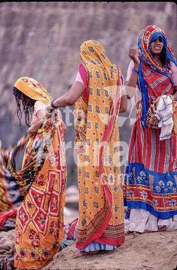 akg7888845 Religions / Hinduism. - Pilgrimage festival in Kaila, Rajasthan, India (Kaila Devi Mela; pilgrimage festival in honor of the goddess Mahalakshmi in the Hindu month Chaira. March / April): women pilgrims preparing for the ritual bath. - Photo, April 1982.