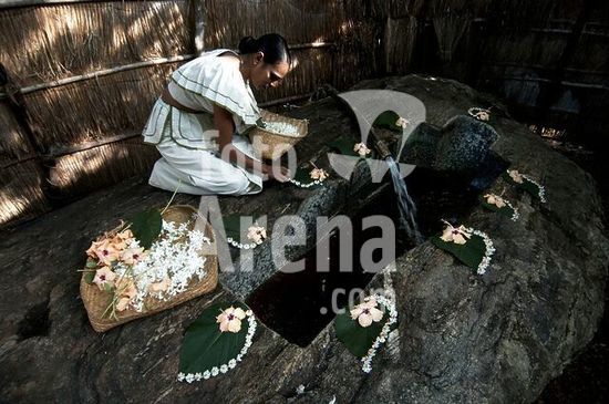 akg883715 Health / Ayurveda. Woman preparing a herbal bath an an Ayurveda health centre, Sri Lanka. Photo, Jochem Wijnands.