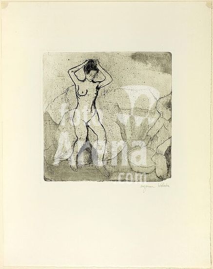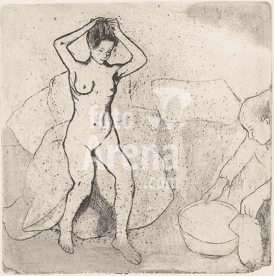 alb9485923 Naked woman lifting her hair takes a bath Catherine prepares the tub and Louise our coiffe, print maker: Suzanne Valadon, (signed by artist), France, 1895, paper, etching, drypoint, h 229 mm × w 225 mm.