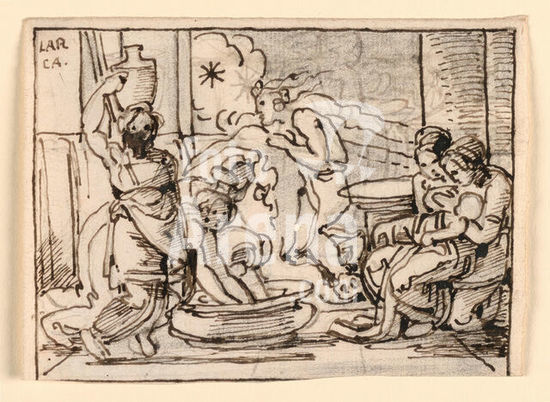 alb5186397 Preparing the Bath for the Christ Child, Fortunato Duranti, Italian, 1787 - 1863, Graphite, pen and bistre, brush and gray wash on paper, At left, women prepare the bath in a large, round basin, while another woman brings the water. At right are two seated figures, one holding the child. The Star of Bethlehem is visible through an opening in the background., Rome, Italy, ca. 1825, Drawing, Drawing.