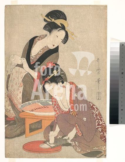 alb3608453 Women Preparing Sashimi. Artist: Kitagawa Utamaro (Japanese, ca. 1754-1806). Culture: Japan. Dimensions: 15 x 10 in. (38.1 x 25.4 cm). Date: 1806-20.Utamaro expanded the scope of the bijin-ga, prints of beautiful women, by removing the traditional idealizing constraints of the genre and placing beautiful women in the context of ordinary life. Among the themes he explored in this broadening of his subject matter were the activities of the kitchen. Museum: Metropolitan Museum of Art, New York, USA.