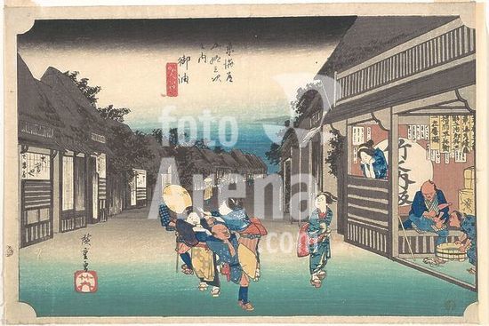 alb3622022 Goyu, Tabibito Ryujo. Artist: Utagawa Hiroshige (Japanese, Tokyo (Edo) 1797-1858 Tokyo (Edo)). Culture: Japan. Dimensions: 9 15/32 x 14 in. (24.1 x 35.6 cm). Date: ca. 1833-34.Two women are trying to drag two reluctant travelers into their inns: these four figures create a vortex of humor and energy. Another traveler is preparing to wash his feet in a water basin at the entrance to an inn where he will spend the night. Information about the print series can be seen in the yellow cartouches inside the inn, which read "The Tokaido Picture--Continued," "Engraver Jirobei," "Printer, Heibei," and "Painting(s) by Ichiryusai." (Ichiryusai is one of Hiroshige's pseudonyms.) The large circle half-concealed by a post bears the name of Takenouchi, the publisher of the Tokaido series. Museum: Metropolitan Museum of Art, New York, USA.