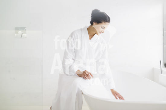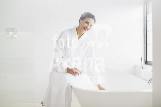 412-16496 Portrait of smiling woman in bathrobe preparing bath