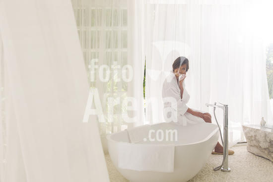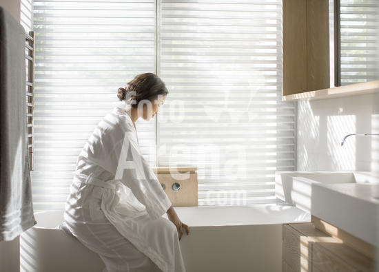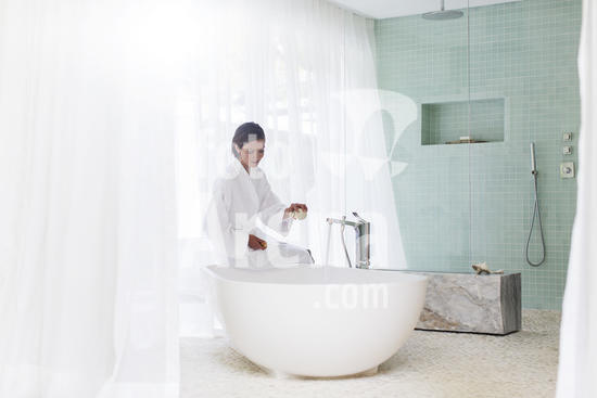 hx00443 Woman in bathrobe drawing a bath in soaking tub in luxury bathroom