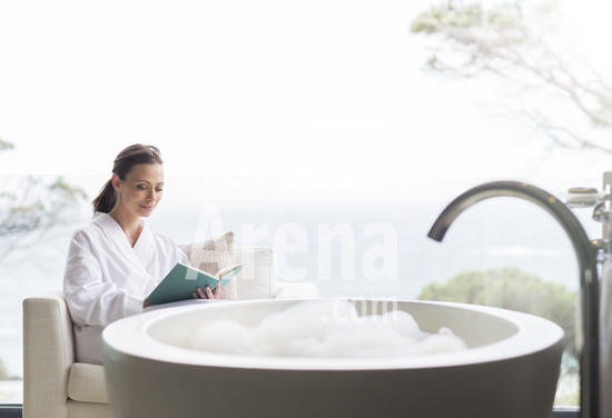 412-22560 Smiling woman in bathrobe reading book in bathroom