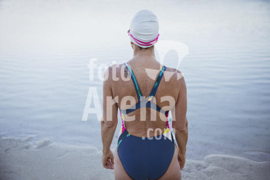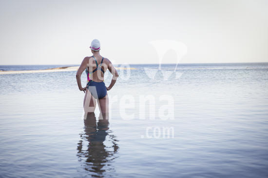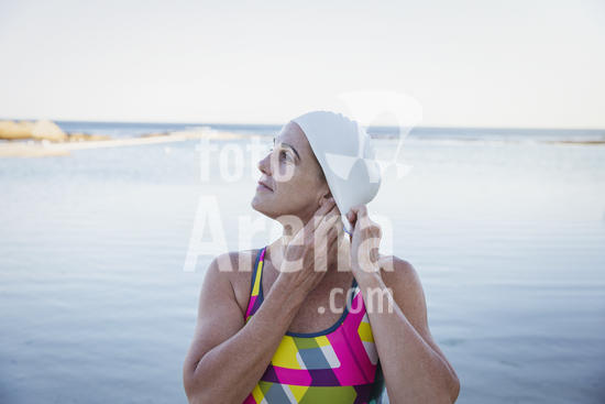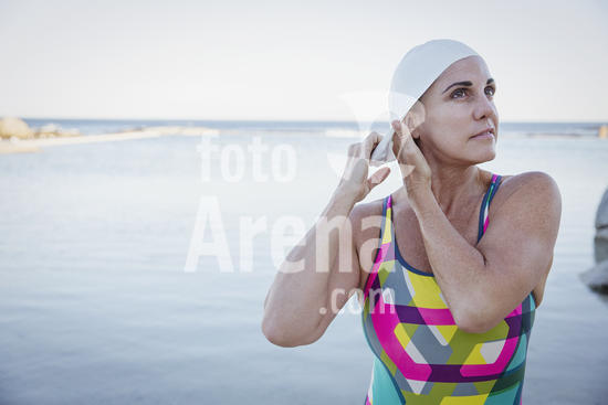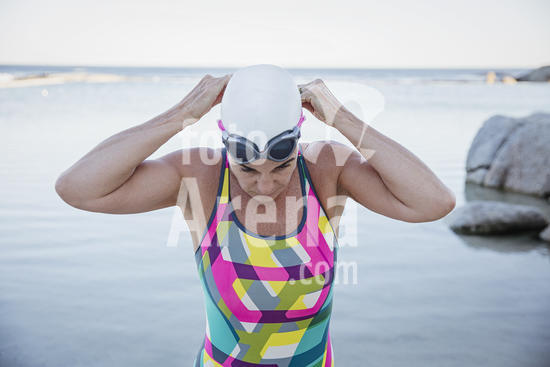 412-37420 Female open water swimmer adjusting swimming cap at ocean