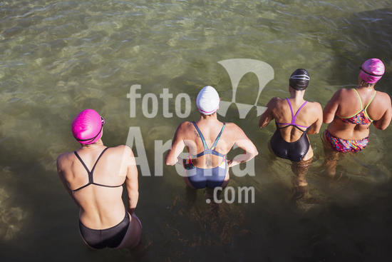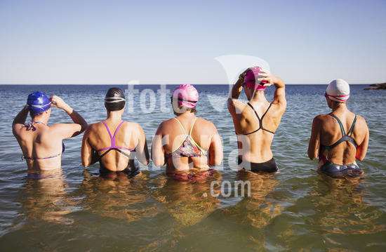 412-37424 Female open water swimmers standing in a row in sunny ocean surf