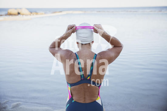 412-37425 Female open water swimmer adjusting swimming goggles at ocean