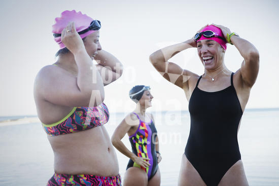 412-37448 Smiling female open water swimmers adjusting swimming caps at ocean