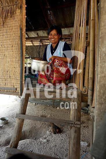 iblflk03308284 Woman holding a pot at the entrance of her traditional stilt house made of wood and bamboo, Trapang Village, Bathi District, Takéo Province, Cambodia, Asia