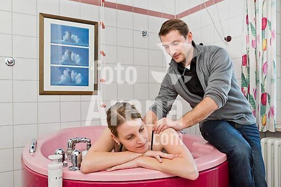 ibljmt03032272 Expectant father massaging his wife's shoulders during childbirth in a birthing bath, Germany, Europe