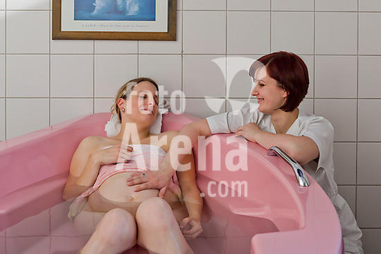 ibljmt03032278 Woman during childbirth in a birthing bath in the maternity delivery room beside her midwife, Germany, Europe
