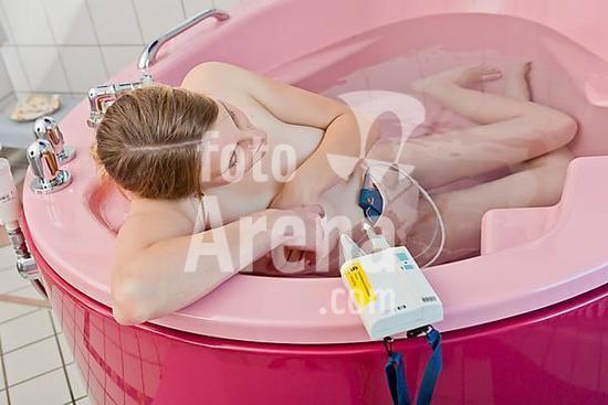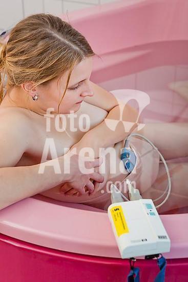 ibljmt03032356 Woman during childbirth with a cardiotocography or CTG in a birthing bath in the maternity delivery room, Germany, Europe