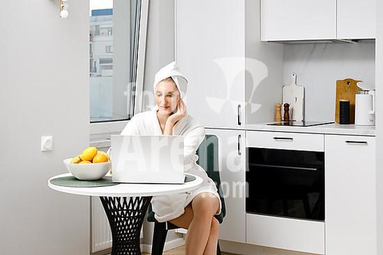 ibxaii10037258 Serious young woman in bathrobe sits in the kitchen with laptop