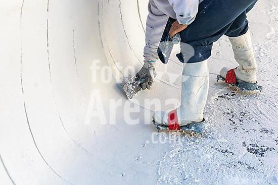 ibxdea08209676 Worker wearing spiked shoes smoothing wet pool plaster with trowel