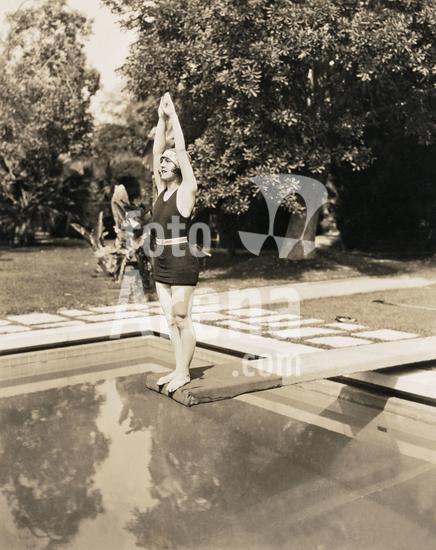 990_05_3-Sport-Swim-D_11HR Hollywood, California: c. 1924 Warner Brothers movie actress Patsy Ruth Miller exhibits her perfect form at the end of a diving board.