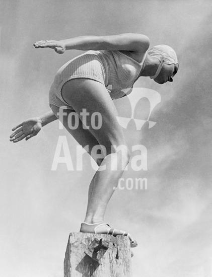 990_05_3-Sport-Swim-D_9HR United States: c. 1933 A young woman standing on a pier and ready to dive into the water.