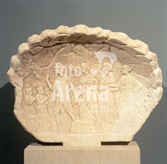 akg1327238 Griechisch, 2. Hälfte 4. Jahhrundert v.Chr.-Weihrelief in Form einer Grotte mit Weihung an die Nymphen (Drei Nymphen, angeführt von Hermes hinter einem Altar, links Pan und Adoranten ( Stifter), ganz rechts der Kopf des Wassergottes Acheloos, Vater der Nymphen).-Marmor, 31 x 40 cm. Aus Megara. Sk 711. Museum: Staatl. Mus., Antikensammlung., BERLIN.