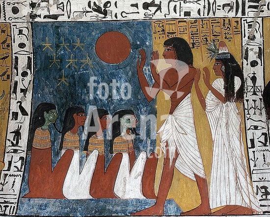 akg928524 Egyptian, New Kingdom, 19th dynasty, time of Seti I / Ramses II, c.1290 BC.-Sennedjem and his wife Iniferti worshipping the heavenly gods, above: moon/ solar disk, accompanied by the seven stars (constellation of the "Great Bear"(?).-/ Wall paint.from the tomb of Sennedjem, Dayr al-Madinah (TT 1), Thebes-West (Egypt).