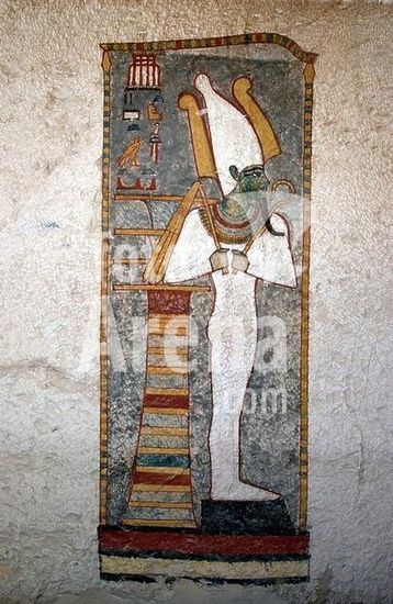 akg1000152 Egyptian, New Kingdom, 18th Dynasty, c. 1300 BC.-Osiris with Djed pillar.-Wall painting. Tomb of Horemheb (KV 57), Valley of the Kings / Biban el-Moluk (West Thebes), Egypt.