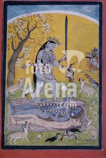 akg1110921 Indian miniature, 18th century.-The goddess Kali, standing on her consort.-(Kali, 'the black one'; in Hinduism of time and change.) Gouache on paper. Museum: Bhuri-Singh-Museum., Chamba.